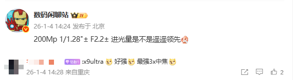 【CNMO科技消息】1月4日益牛网,数码博主@数码闲聊站 爆料称有款新机将后置两亿像素摄像头,传感器尺寸为1/1.28英寸左右,光圈大小为F2.2左右。结合评论区信息与博主表情暗示来看,该机可能为OPPO Find X9 Ultra益牛网。